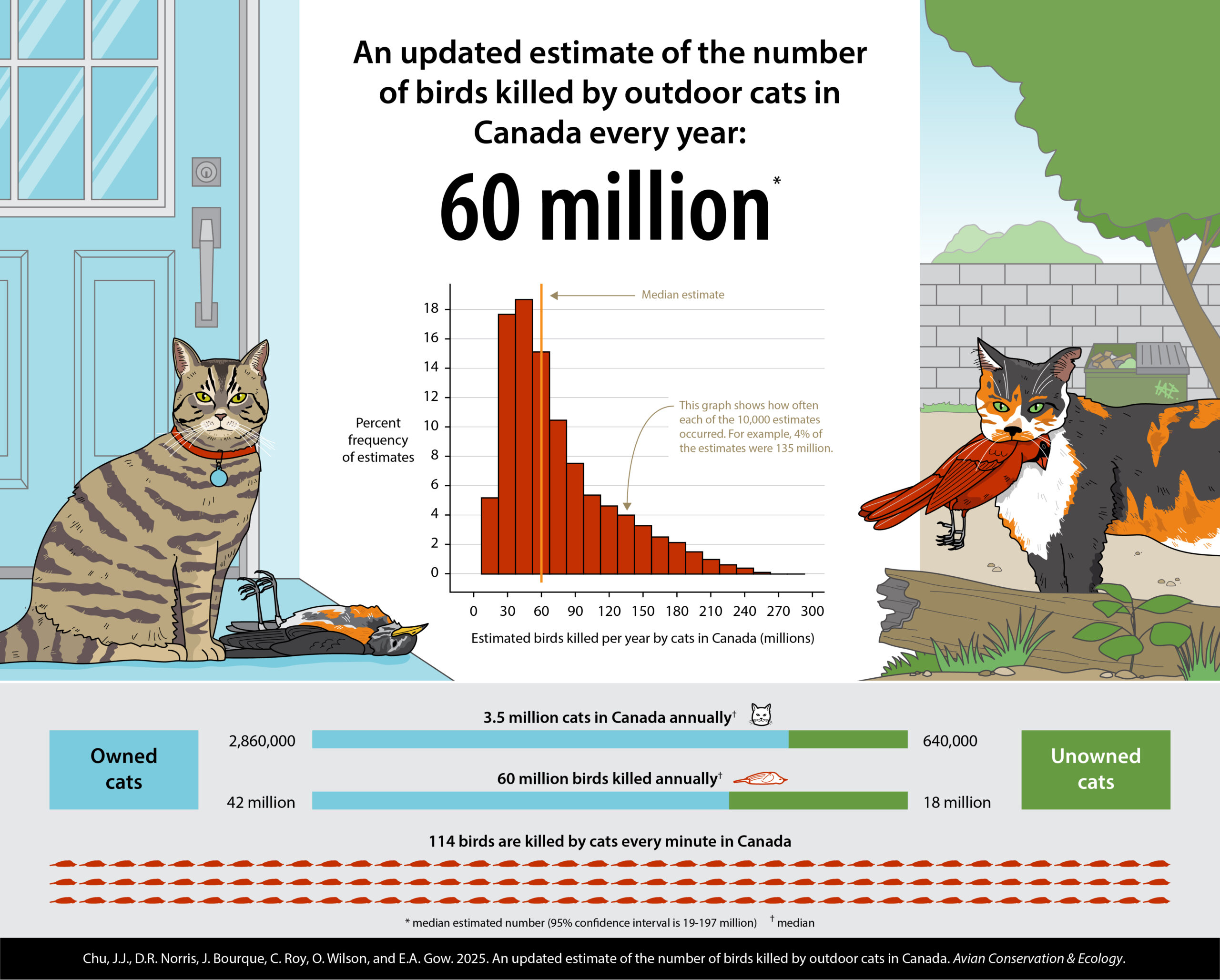 Chu, J. J., Norris, D. R., Bourque, J., Roy, C., Wilson, O., & Gow, E. A.. An updated estimate of the number of birds killed by outdoor cats in Canada. Avian Conservation and Ecology 20(20), art12.